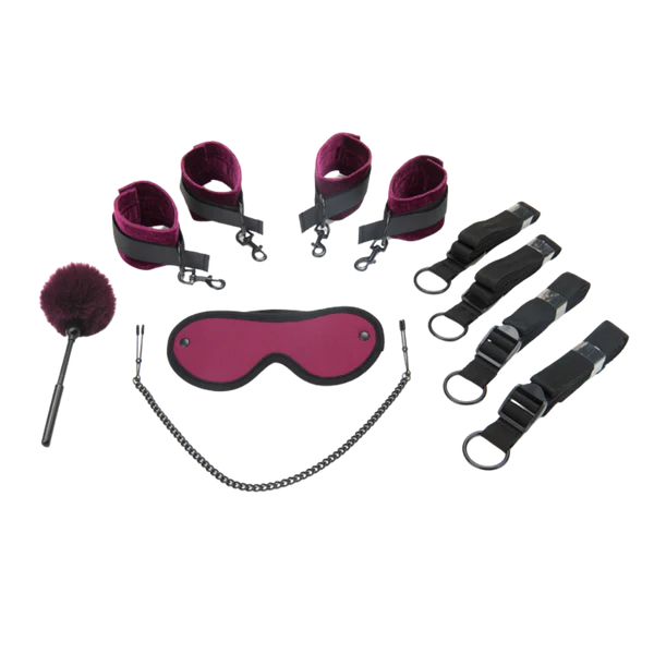 Everything you need for days and nights of exploring is right here. The All-Inclusive Set comes with four provocative accessories: a blindfold, ticker, cuffs, and clamps, to tempt your imagination. Use the cuffs and connectors and get better acquainted with your headboard. Try the blindfold and clamps together and invite your partner to surprise and tease you. Add to (or start!) your intimate collection with this set and leave no desire unexplored.