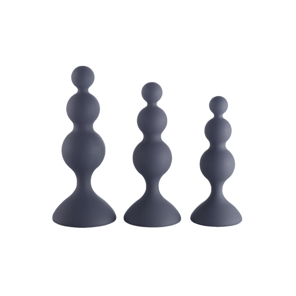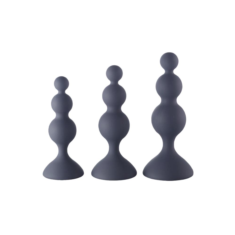 Find your fantasy with the Beaded Trainer Kit. Made of silky soft, flexible silicone, they are the perfect way to work up to your peach play goals. Each trainer is graduated in size, allowing you to start small and move up sizes as you become more comfortable. Silicone trainers are designed for beginners to "train" themselves for backdoor sensations, and helps with allowing for larger girth by teaching the sphincters (fun fact, there's two of them) to relax. The beaded shape adds an extra level of comfort and the flared suction-cup base allows you to easily play on a variety of surfaces.