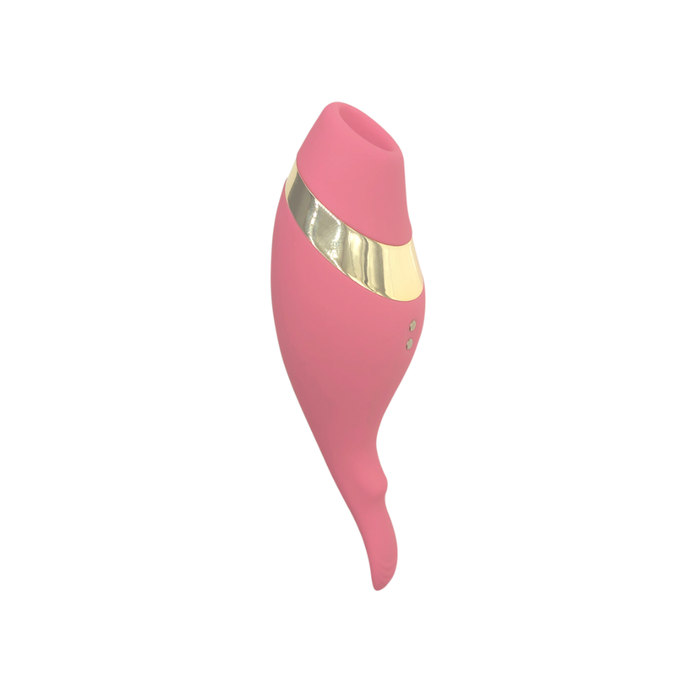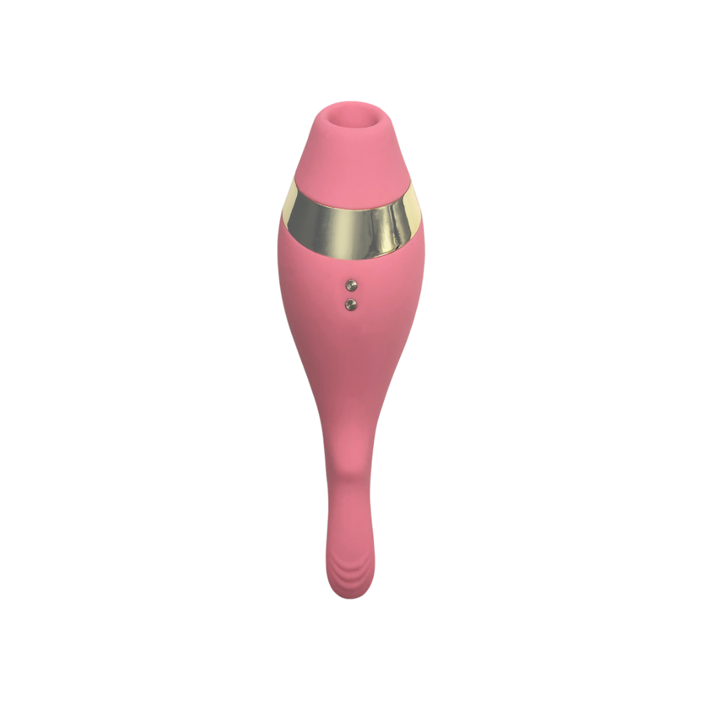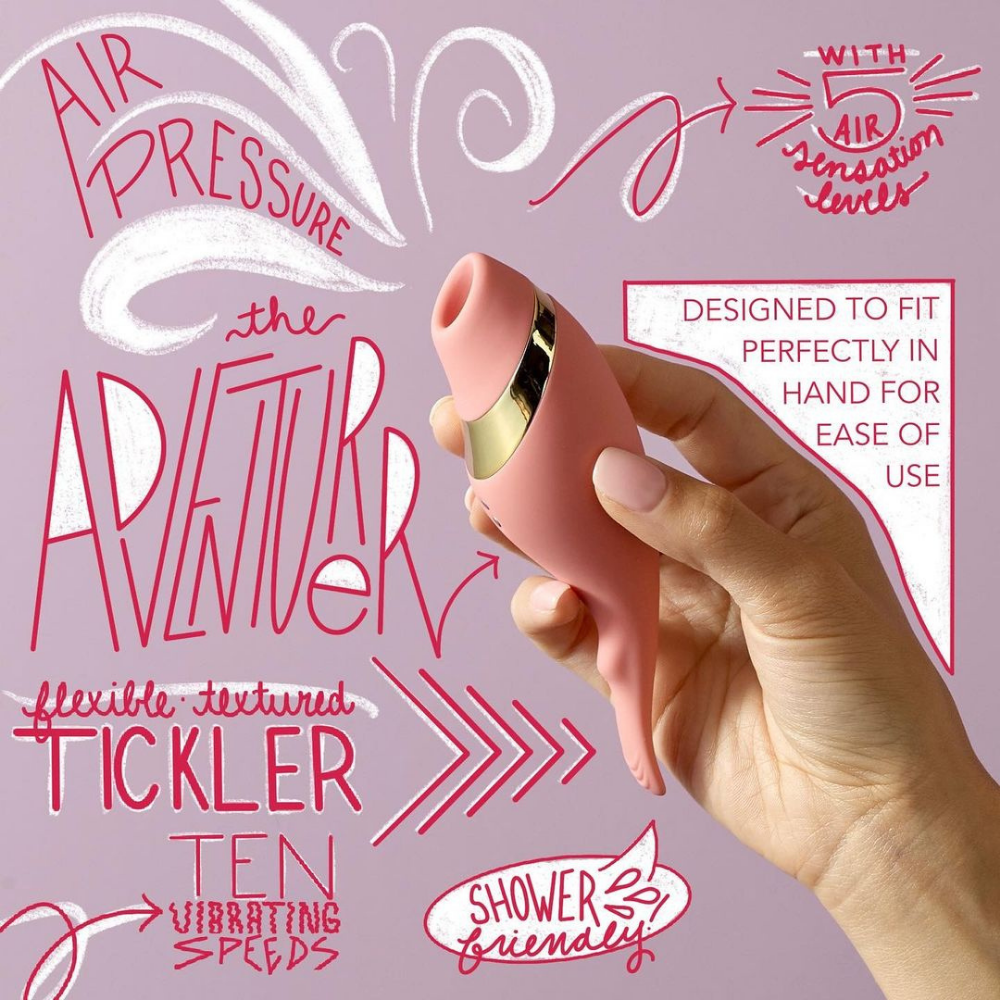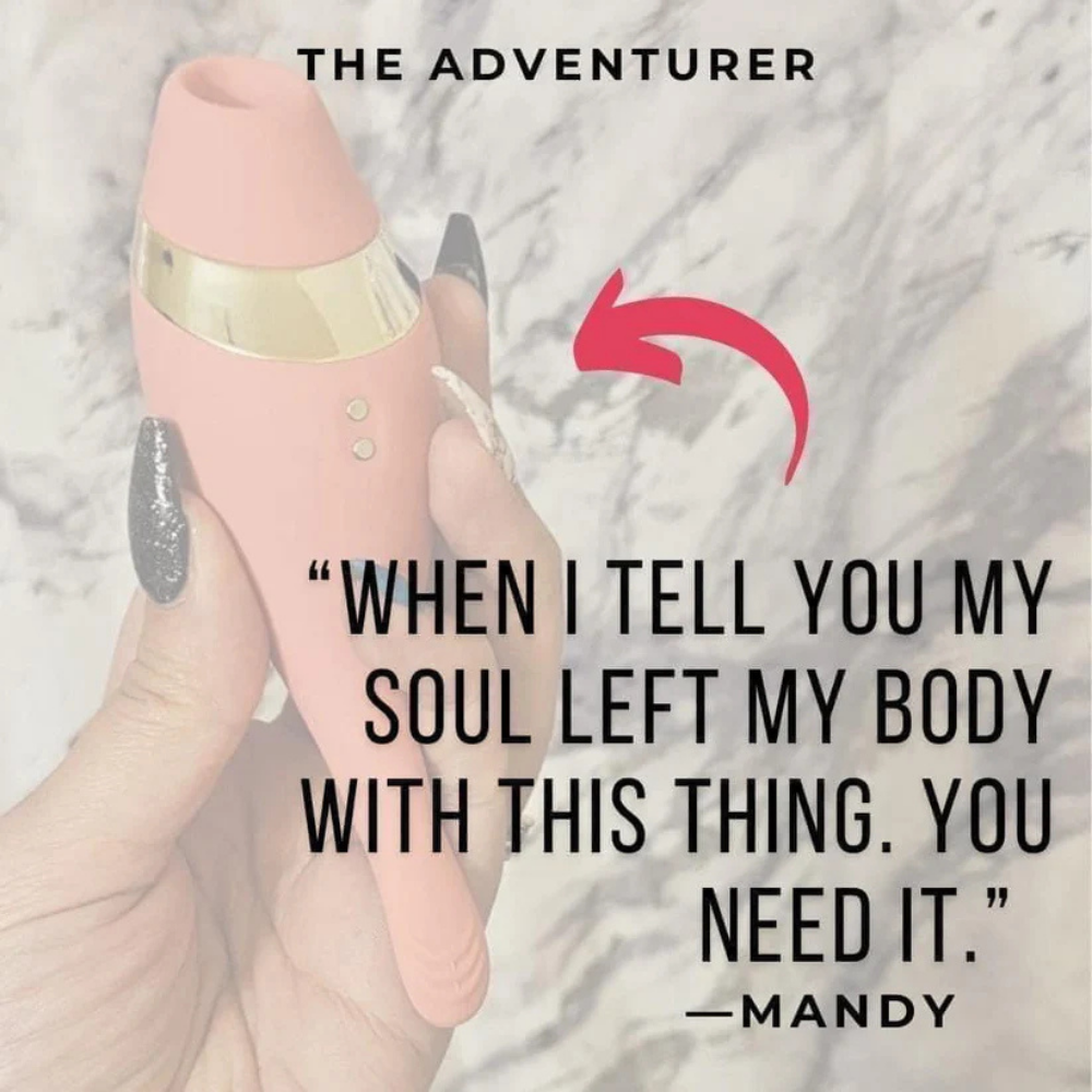 Meet your match with The Adventurer, an exclusive invitation to pleasure. This expertly crafted accessory allows you to explore new dimensions of desire with different types of clitoral stimulation. Set in premium silicone, the gold accent adds a luxe touch while the rounded shape fits perfectly in hand. Let the textured end tantalize with multiple vibration speeds and patterns or fit the accessory's opening around the clitoris for air pressure that takes your breath away.